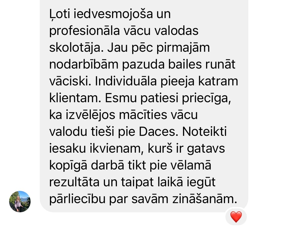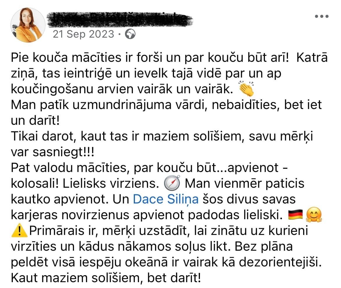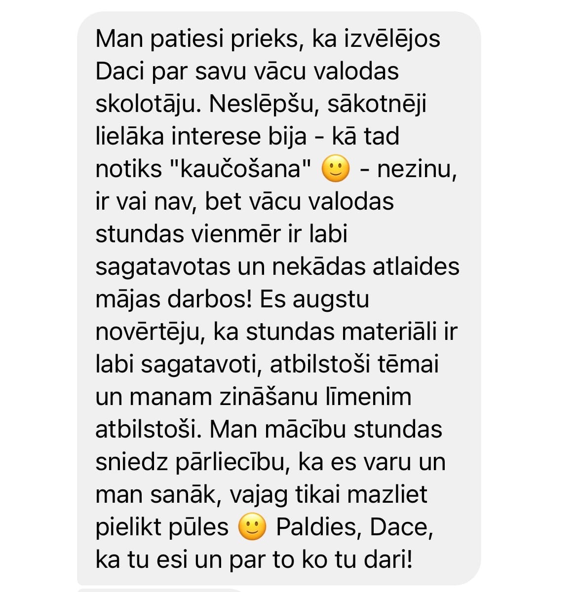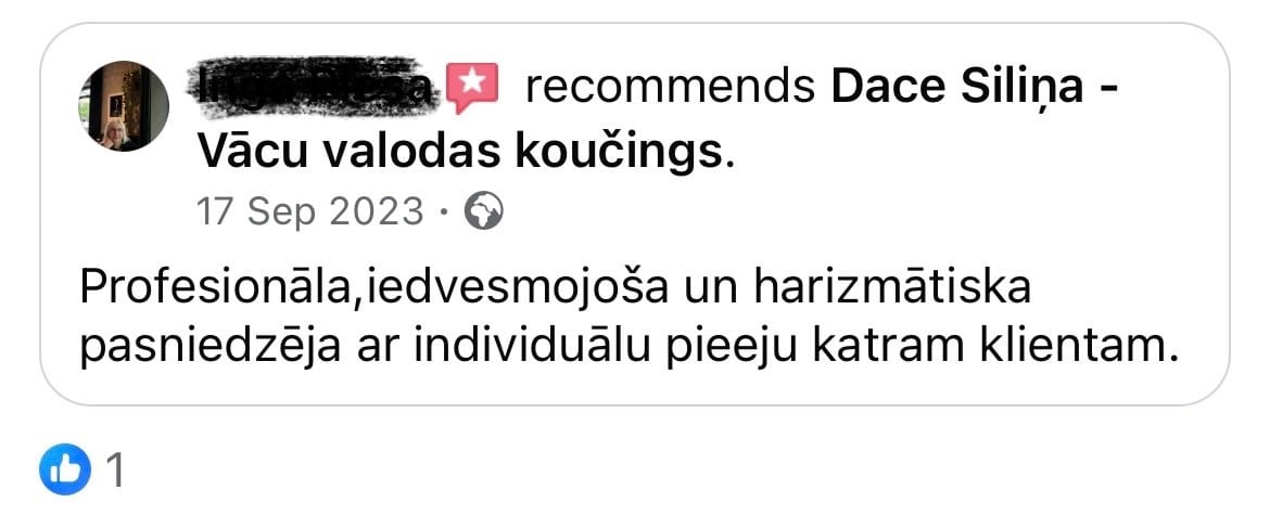 Šo gadu laikā vācu valodas koučinga metode ir sevi pierādījusi, palīdzot maniem studentiem ne tikai iegūt pārliecību par vācu valodas zināšanām, bet arī sasniegt jaunas karjeras virsotnes un brīvi komunicēt vāciski runājošās valstīs.