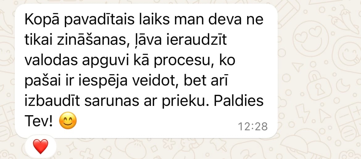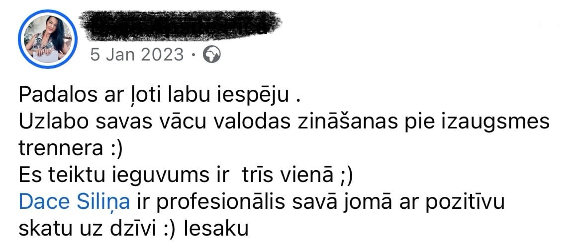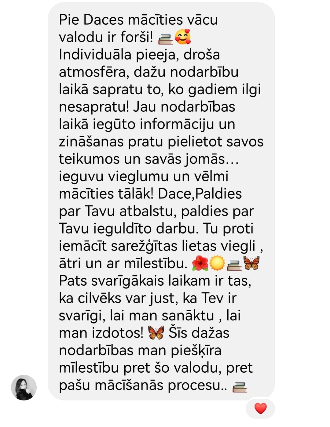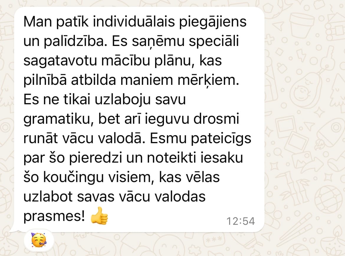 Šo gadu laikā vācu valodas koučinga metode ir sevi pierādījusi, palīdzot maniem studentiem ne tikai iegūt pārliecību par vācu valodas zināšanām, bet arī sasniegt jaunas karjeras virsotnes un brīvi komunicēt vāciski runājošās valstīs.