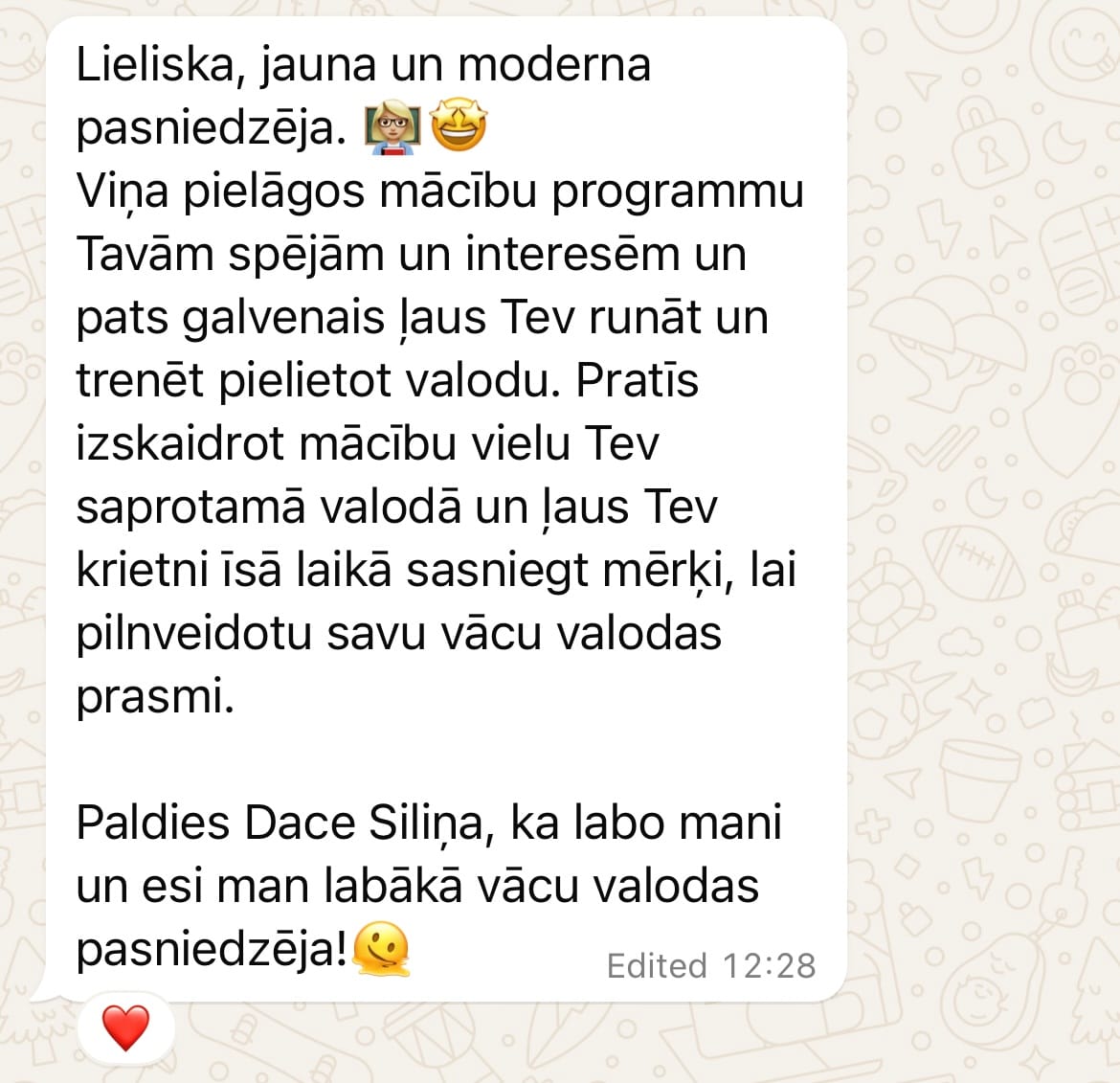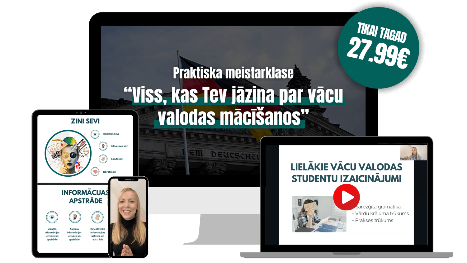 Jau vairākus gadus mācu vācu valodu pusaudžiem un pieaugušajiem, izmantojot koučinga metodes un neirozinātnes pamatprincipus, lai nodrošinātu ātru, efektīvu un vieglu mācīšanās procesu.