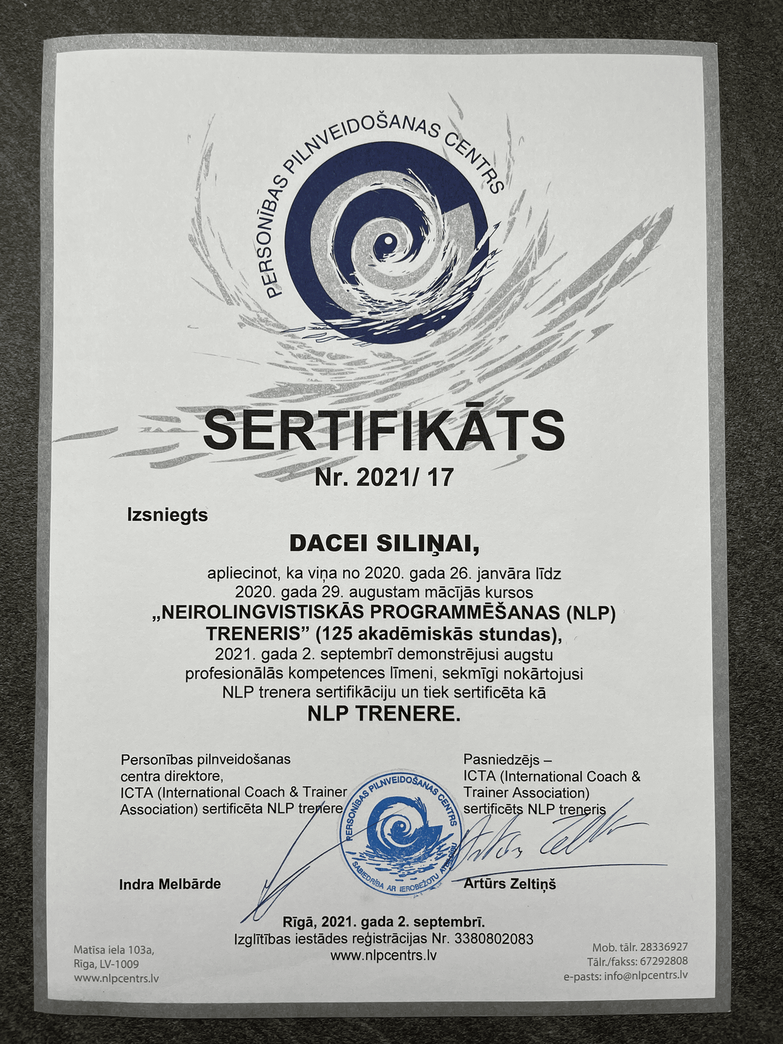 NLP (neirolingvistiskā programmēšana) zināšanas palīdzēja man labāk izprast, kā cilvēki visefektīvāk apgūst jaunas prasmes un kā pielāgot mācību metodes, lai viņi varētu sasniegt savus mērķus īsākā laikā.